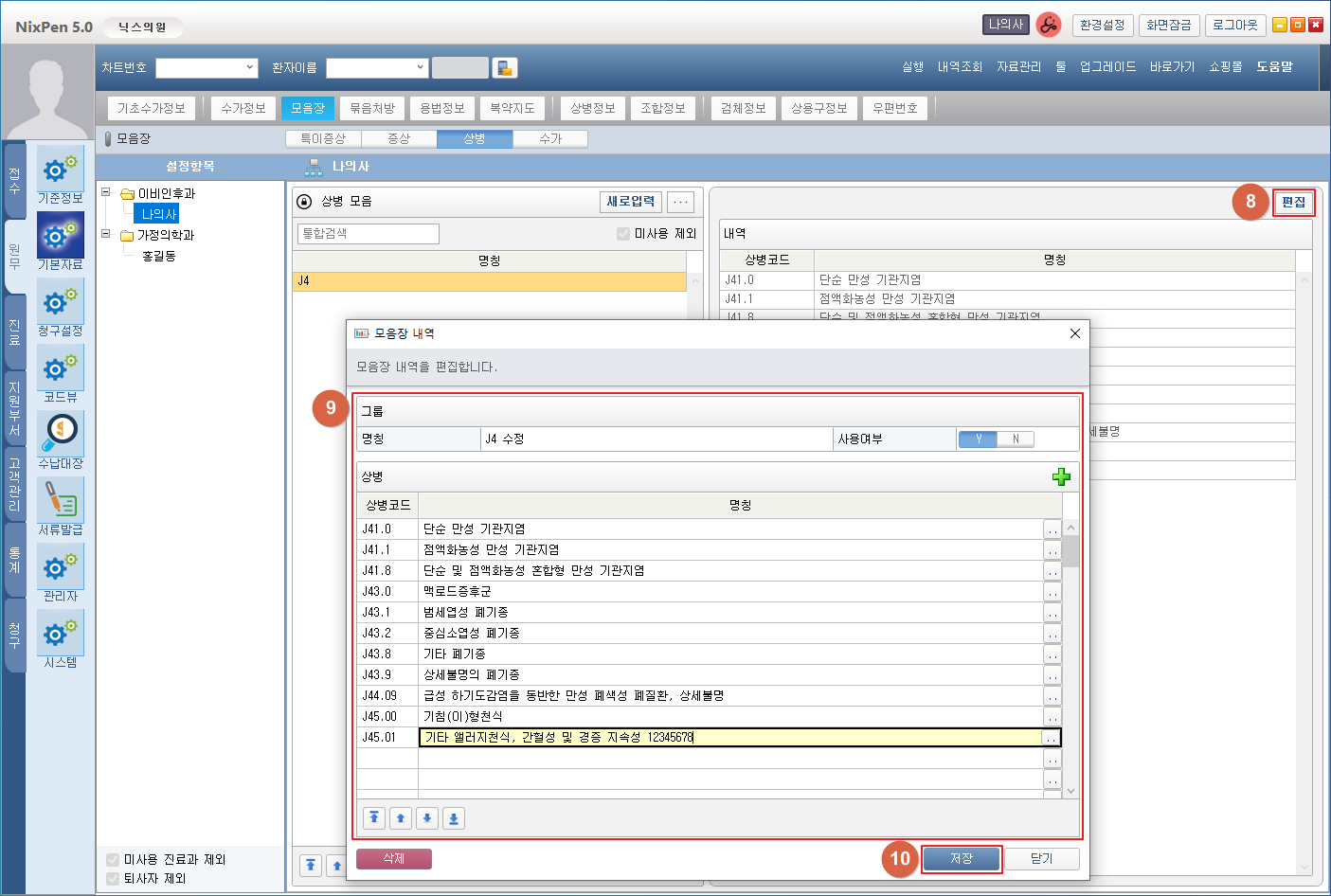 ⑧ [편집] 버튼을 클릭하여 선택된 상병그룹의 편집 창을 팝업 할 수 있습니다.