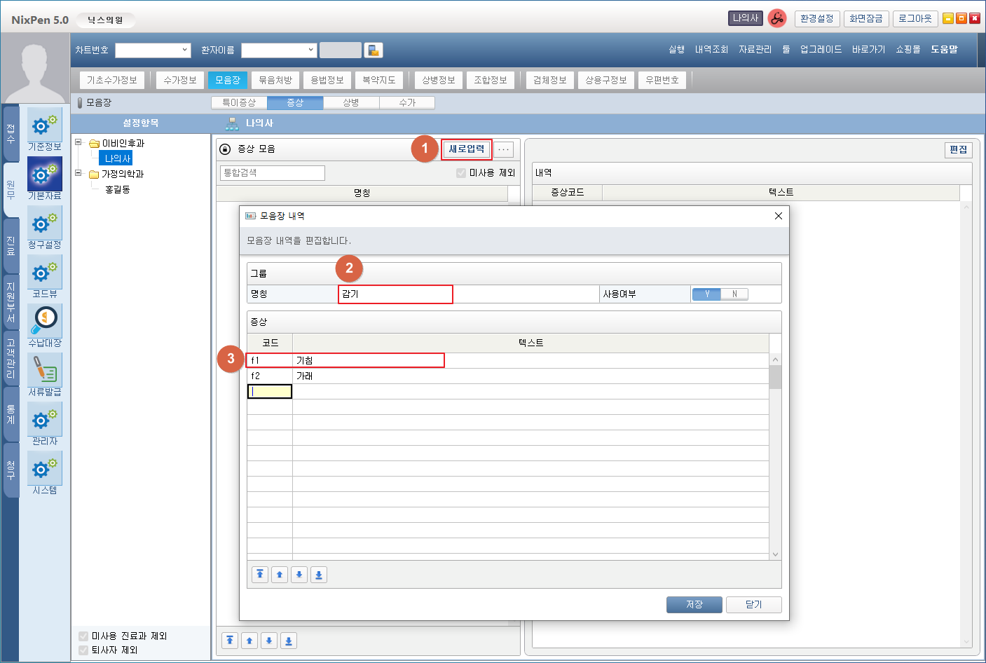 또는 증상그룹이나 증상내역 아이템을 더블클릭하여 편집 창을 팝업 할 수 있습니다.