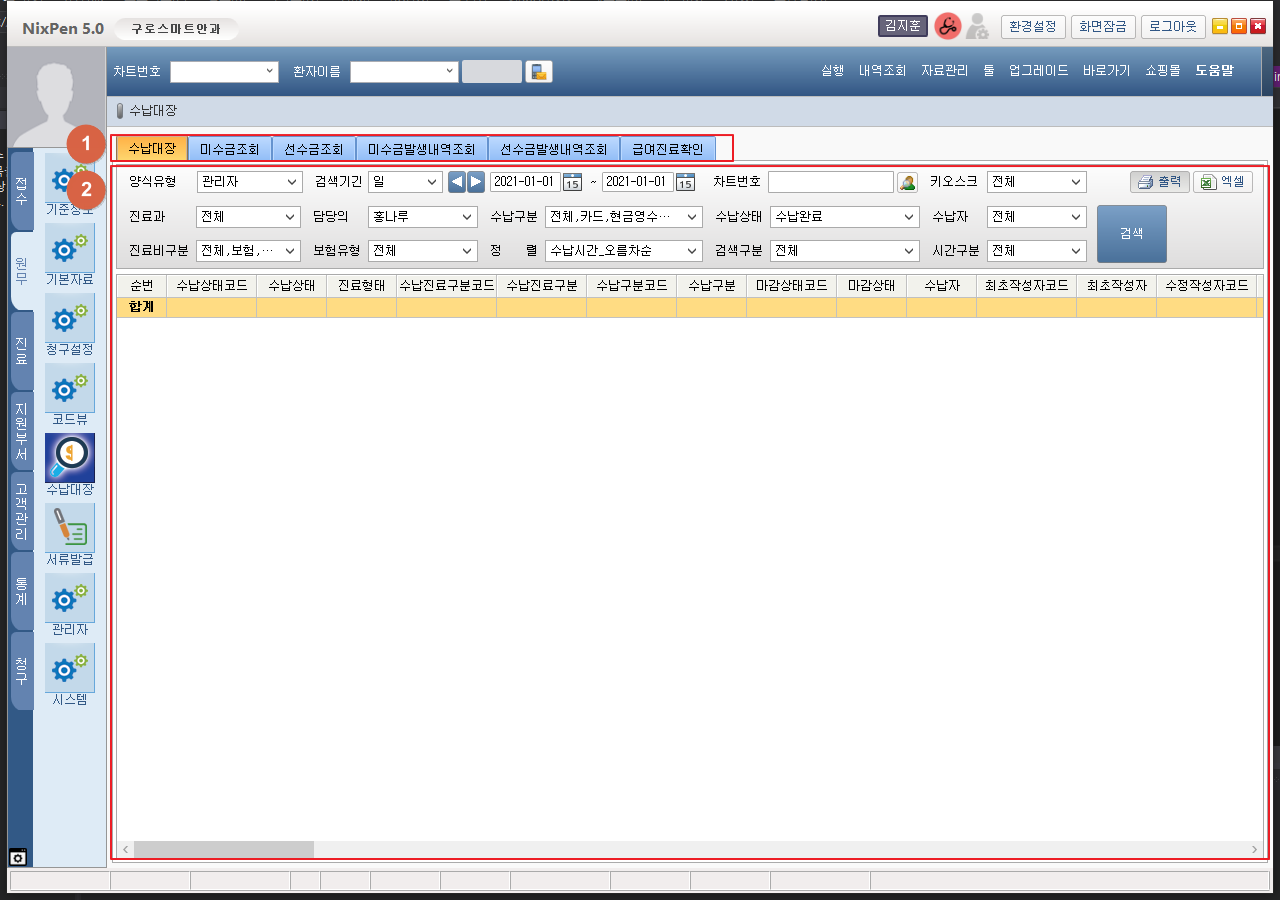 ① 수납대장/미수금조회/선수금조회/미수금방생내역조회/급여진료확인 을 조회할 수 있습니다. ② 검색된 목록이 표시됩니다.