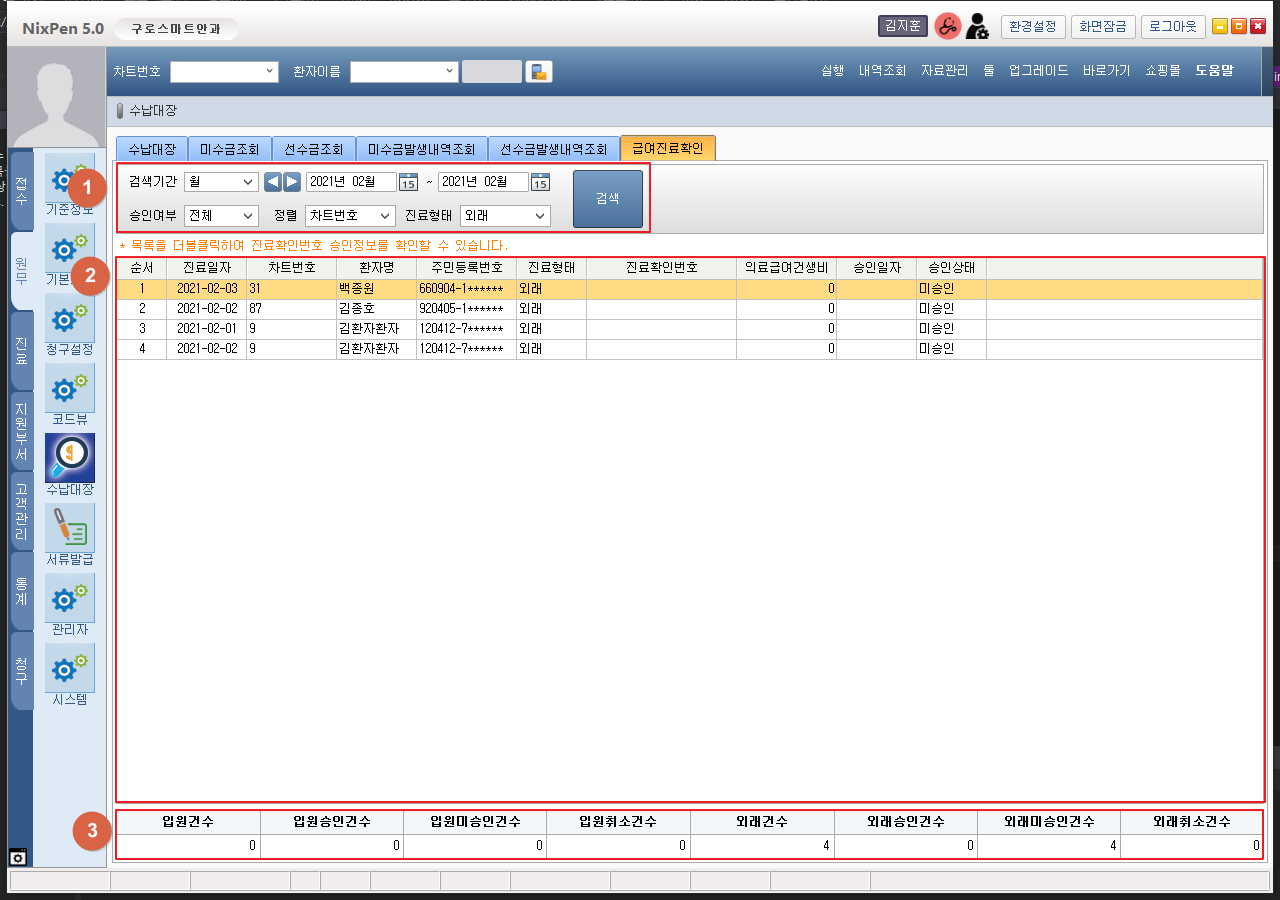 ① 조회 기간 조회 옵션을 설정하고 [검색] 버튼을 클릭합니다. 목록을 더블클릭하여 진료확인번호를 확인할 수 있습니다. 미승인 시 승인창이 승인 시 승인결과창이 표시됩니다. ② 검색된 선수금 발생 목록이 표시됩니다. ③ 검색된 목록의 합계가 표시됩니다. 1. 급여진료확인