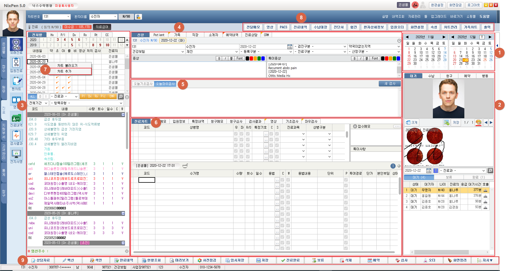 ① 환자의 내원일이 표시됩니다. 날짜를 더블클릭하면 해당 일자의 차트를 입력할 수 있습니다. ② 대기/수납/청구/예약/병동 탭에서 각 목록을 조회할 수 있습니다. 대기탭 상단에서 진료이미지를 사용할 수 있습니다. ③ 전처방, Hx모음장, P/I모음장, Dx모음장, Rx모음장, 묶음처방을 확인 및 사용할 수 있습니다. ④ 환자 정보를 확인할 수 있습니다. 증상 및 특이증상을 입력할 수 있습니다. ⑤ 오늘 기초검사, 오늘 좌우검사 기록을 확인할 수 있습니다. ⑥ 진료차트 입력이 가능합니다. 다른 탭으로 이동하여 각 진료정보를 확인할 수 있습니다. ⑦ 환자 조회 시 오늘 새 차트 추가가 가능합니다. 요약기록에서 진료기록 선택 후 우클릭 시 해당 일자에 차트추가가 가능합니다. ⑧ 툴 버튼의 각 기능을 사용할 수 있습니다. ⑨ 사용자 버튼의 각 기능을 사용할 수 있습니다. 1. 외래진료