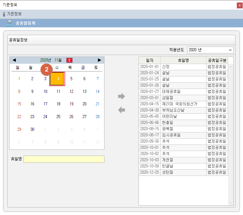 ② [공휴일 등록] 메뉴 클릭 시 기준정보의 공휴일 등록화면이 창으로 팝업됩니다.