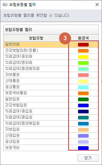 ③ [보험유형별 컬러] 메뉴 클릭 시 보험유형별 컬러 창이 팝업됩니다.