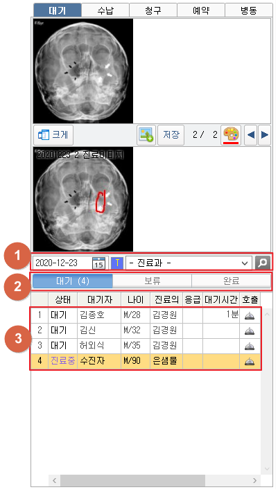 ① 날짜를 선택하여 대기자 목록을 검색할 수 있습니다. [T] 버튼 클릭 시 선택 날짜가 오늘로 변경됩니다. 진료과를 선택하여 대기자 목록을 검색할 수 있습니다. 검색조건 변경 시 즉시 검색됩니다. 검색 버튼 클릭 시 검색조건 변경 없이 검색할 수 있습니다. ② [대기자] 버튼 클릭 시 진료대기 중인 환자와 진료중 환자가 표시됩니다. [보류] 버튼 클릭 시 보류상태인 환자가 표시됩니다. [완료] 버튼 클릭 시 진료완료 상태인 환자가 표시됩니다. ③ 진료대기 목록에서 더블클릭 시 선택환자를 호출 후 불러옵니다. 보류, 완료 목록에서 더블클릭 시 선택환자를 불러옵니다. 호출 버튼 클릭 시 환자를 호출합니다. 순번, 상태 우클릭 시 컨텍스트 메뉴가 열립니다. 진료대기, 완료 목록에서 우클릭 시 재호출 메뉴가 열립니다. 보류 목록에서 우클릭 시 재호출, 진료진행 상태 메뉴가 열립니다. 툴팁에서 추가정보를 확인할 수 있습니다. 사용자 설정의 대기자화면에서 대기자 툴팁 옵션과 새로고침 갱신주기를 변경할 수 있습니다. 1. 대기