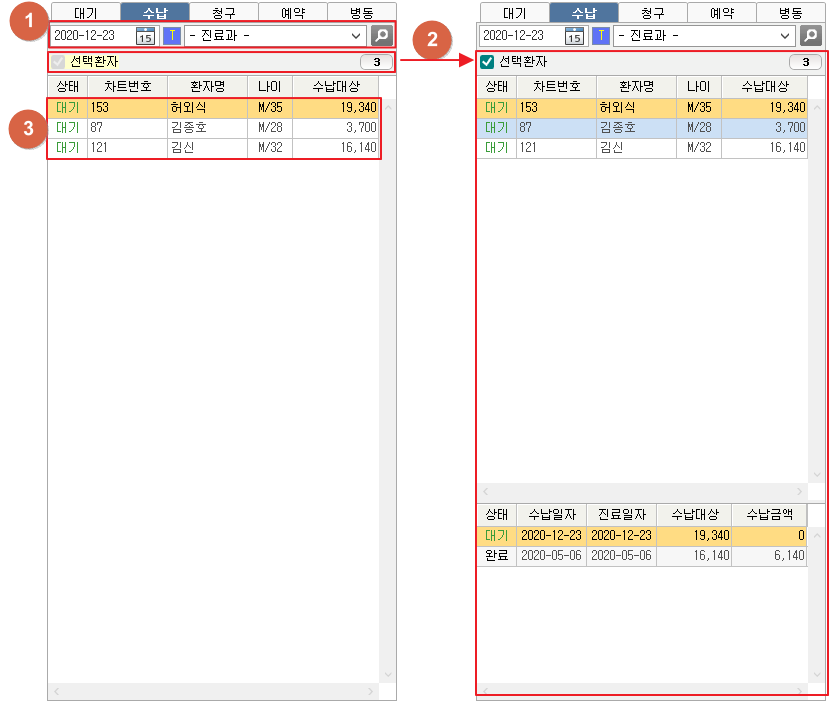 ① 날짜를 선택하여 수납 대기자 목록을 검색할 수 있습니다. [T] 버튼 클릭 시 선택 날짜가 오늘로 변경됩니다. 진료과를 선택하여 수납 대기자 목록을 검색할 수 있습니다. 검색조건 변경 시 즉시 검색됩니다. 검색 버튼 클릭 시 검색조건 변경 없이 검색할 수 있습니다. ② 선택환자 체크 시 목록하단에 현재 조회되어있는 환자의 수납내역이 표시됩니다. 회색 영역 안 숫자는 수납 대기 목록 건 수 입니다. ③ 목록에서 더블클릭 시 선택환자를 불러옵니다. 2. 수납