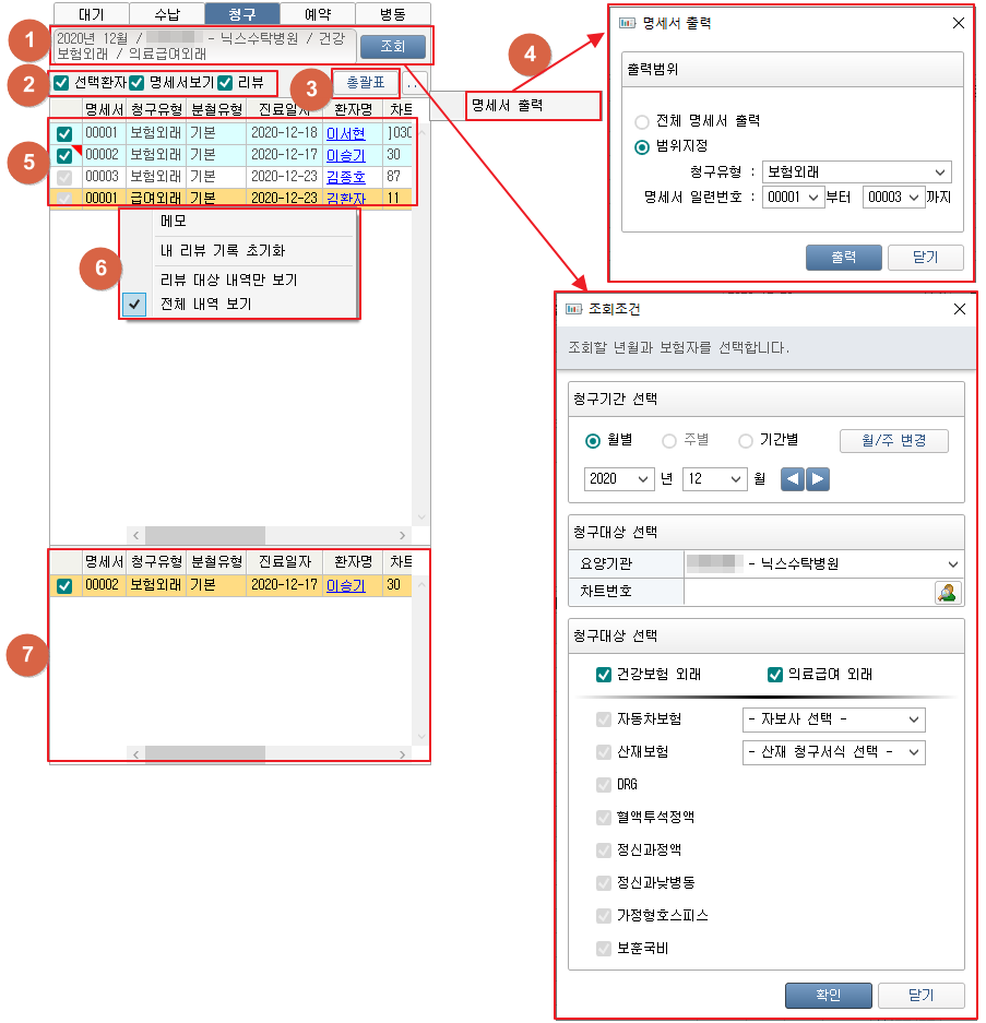 ① [조회] 버튼 클릭 시 조회 조건 창이 팝업 됩니다. 조회 조건 창에서 청구 기간 및 대상 선택 후 확인 버튼을 누르면 회색영역에 선택된 조건이 표시됩니다. ② 선택환자를 체크하면 ⑦번 영역에 현재 조회되어있는 환자의 명세서내역이 표시됩니다. 명세서보기에 체크되어있는 경우 리뷰 시 전처방 영역에 진료비 명세서 화면이 표시됩니다. 리뷰에 체크되어있는 경우 목록 더블클릭 시 리뷰된 것으로 체크됩니다. ③ [총괄표] 버튼 클릭 시 총괄표 창이 팝업됩니다. ④ [...] 버튼 클릭 시 컨텍스트 메뉴가 열립니다. [명세서 출력] 메뉴 클릭 시 명세서 출력 창이 팝업됩니다. 출력 범위 지정 후 [출력] 버튼 클릭 시 명세서가 즉시 출력됩니다. ⑤ 명세서 목록에서 더블클릭 시 환자를 불러옵니다. 리뷰된 내역은 체크박스에 체크되고 하늘색으로 배경색이 표시됩니다. 메모가 입력되어있는 경우 체크박스 우측에 붉은 표지가 표시됩니다. 체크를 해제할 경우 배경색이 사라집니다. ⑥ 목록 우클릭 시 컨텍스트 메뉴가 열립니다. [메모] 메뉴 클릭 시 리뷰 메모 입력 창이 팝업됩니다. [내 리뷰기록 초기화] 메뉴 클릭 시 리뷰된 것으로 표시된 내역이 모두 초기화 됩니다. [리뷰 대상 내역만 보기] 메뉴 클릭 시 목록에 리뷰됨으로 체크되지 않은 내역만 표시됩니다. [전체 내역 보기] 메뉴 클릭 시 리뷰 여부와 관계없이 전체 내역이 표시됩니다. ⑦ ②번 영역의 선택환자에 체크 되어있는 경우 표시됩니다. 현재 조회되어있는 환자의 명세서내역이 표시됩니다. 3. 청구