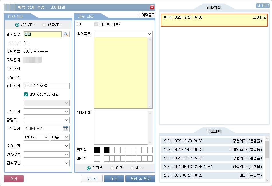 ① 날짜를 선택하여 예약 목록을 검색할 수 있습니다. [T] 버튼 클릭 시 선택 날짜가 오늘로 변경됩니다. 진료과를 선택하여 예약 목록을 검색할 수 있습니다. 검색조건 변경 시 즉시 검색됩니다. 검색 버튼 클릭 시 검색조건 변경 없이 검색할 수 있습니다. ② 선택환자 체크 시 목록하단에 현재 조회되어있는 환자의 예약내역이 표시됩니다. 회색 영역 안 숫자는 예약 건 수 입니다. ③ 목록에서 더블클릭 시 선택환자를 불러옵니다. ④ 목록에서 우클릭 시 컨텍스트 메뉴가 열립니다. [예약 상세정보 보기] 메뉴 클릭 시 선택된 예약 내역에 대한 예약 상세 수정 창이 팝업됩니다. 4. 예약