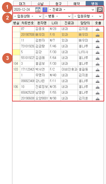① 날짜를 선택하여 입원 목록을 검색할 수 있습니다. [T] 버튼 클릭 시 선택 날짜가 오늘로 변경됩니다. 진료과를 선택하여 대기자 목록을 검색할 수 있습니다. 검색조건 변경 시 즉시 검색됩니다. 검색 버튼 클릭 시 검색조건 변경 없이 검색할 수 있습니다. ② 검색된 목록을 입원상태, 병동, 입원유형별로 필터링 할 수 있습니다. ③ 입원 목록에서 더블클릭 시 선택환자를 호출 후 불러옵니다. 호출 버튼 클릭 시 환자를 호출합니다. 병실 컬럼에서는 기준일자의 입원상태에 따라 배경색이 표시됩니다. 툴팁에서 추가정보를 확인할 수 있습니다. 5. 병동
