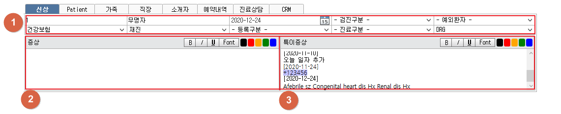 ① 진료를 볼 환자의 신상을 확인 및 수정할 수 있습니다. ② 진료일자의 증상을 수정할 수 있습니다. 증상 입력후 하단 사용자설정의 [저장] 버튼을 클릭합니다. ③ 환자의 특이증상을 수정할 수 있습니다. 1. 신상
