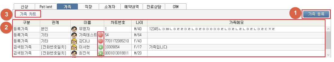① [가족등록] 버튼을 클릭하여 가족을 등록할 수 있습니다. ② 등록가족이 있는 경우 목록에서 확인할 수 있습니다. 전화번호가 일치하거나 증번호가 일치하는 경우 '검색된가족'으로 표시됩니다. ③ [가족 차트] 버튼 클릭 시 가족차트창이 팝업됩니다. 3. 가족