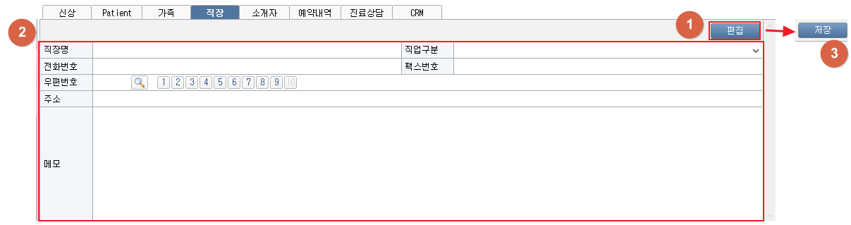① [편집] 버튼을 클릭합니다. ② 직장정보를 입력합니다. ③ [저장] 버튼을 클릭하여 직장 정보를 저장합니다. 4. 직장