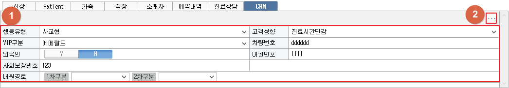 ① CRM 내용을 입력합니다. 입력한 내용은 진료 저장 시 함께 저장됩니다. ② [...] 버튼 클릭 후 [내원경로 설정] 메뉴 클릭 시 1차내원경로, 2차 내원경로, 제휴업체 편집이 가능합니다. [...] 버튼 클릭 후 [국적 관리] 메뉴 클릭 시 국적 정보 편집이 가능합니다. 8. CRM