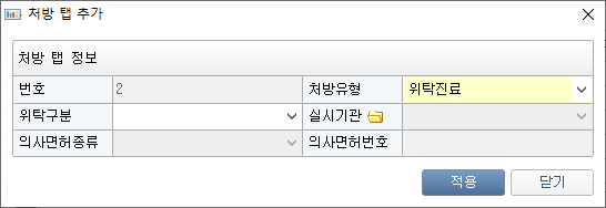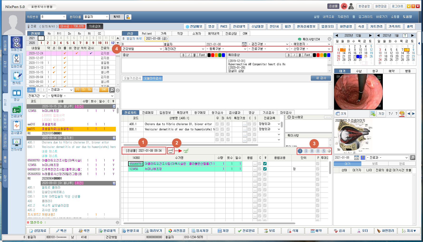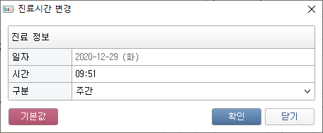 ① 진료의사, 진료일시 정보를 표시합니다. 진료일시를 클릭 시 진료일시 변경 창이 팝업됩니다. ② 가루약 처방여부를 표시합니다. [ 1. 진료정보 ] 버튼을 클릭하여 가루약 처방/처방안함 변경할 수 있습니다. ③ 차트 처방유형 및 차트개수를 표시합니다. [+] 버튼을 클릭하여 처방을 추가할 수 있습니다. ④ 진료의 보험구분, 초재진구분, 등록구분, 진료구분, 산정구분을 확인 및 변경할 수 있습니다. 진료구분에 따라 진찰료 산정이 달라집니다.