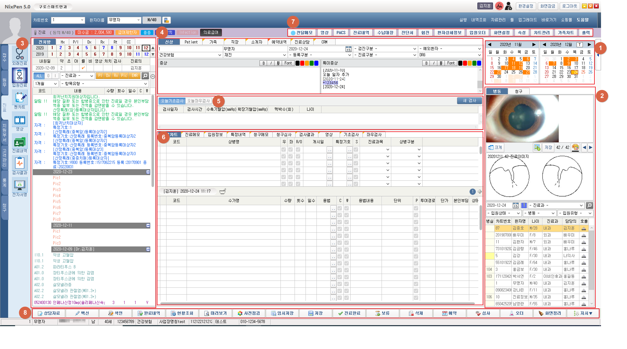 ① 환자의 내원일이 표시됩니다. 날짜를 더블클릭하면 해당 일자의 차트를 입력할 수 있습니다. ② 병동/청구 탭에서 각 목록을 조회할 수 있습니다. 병동탭 상단에서 진료이미지를 사용할 수 있습니다. ③ 전처방, Hx모음장, P/I모음장, Dx모음장, Rx모음장, 묶음처방을 확인 및 사용할 수 있습니다. ④ 환자 정보를 확인할 수 있습니다. 증상 및 특이증상을 입력할 수 있습니다. ⑤ 오늘 기초검사, 오늘 좌우검사 기록을 확인할 수 있습니다. ⑥ 진료차트 입력이 가능합니다. 다른 탭으로 이동하여 각 진료정보를 확인할 수 있습니다. ⑦ 툴 버튼의 각 기능을 사용할 수 있습니다. ⑧ 사용자 버튼의 각 기능을 사용할 수 있습니다. 1. 입원진료
