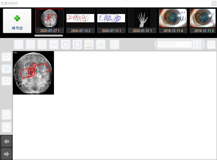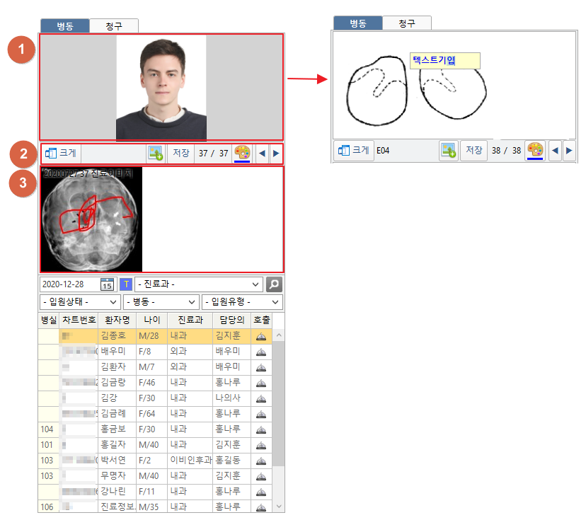 ] 버튼을 클릭하여 그리기 색, 텍스트 색을 변경할 수 있습니다. [◀] [▶] 버튼을 클릭하여 ③진료이미지가 변경됩니다. ③ 저장 된 진료이미지가 표시됩니다. 우클릭, 더블클릭하여 진료이미지를 삭제 할 수 있습니다.