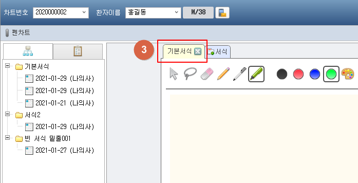 ③ 환자 선택 시 기본서식으로 지정된 서식탭이 자동으로 추가됩니다.