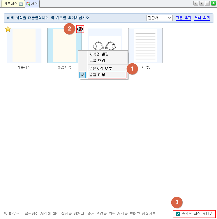 ③ [숨겨진 서식 보이기] 체크 상태를 변경하여