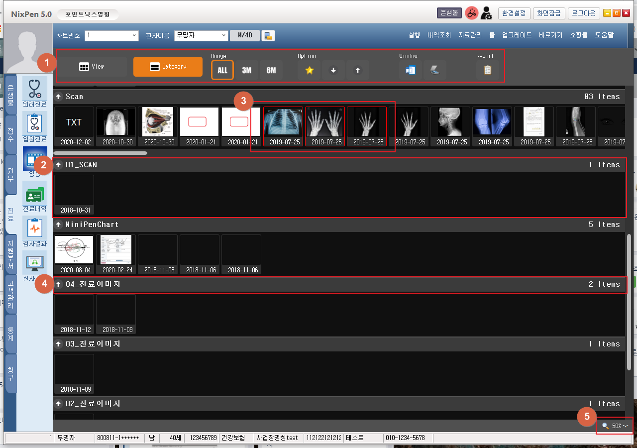 ① 기능버튼을 사용할 수 있습니다. ② 각 카테고리별로 영상이 표시됩니다. ③ 영상 목록을 썸네일로 표시합니다. 영상을 선택하지 않은 상태로 썸네일 우클릭 시 전체 영상이 표시된 영상비교 창이 팝업됩니다. 영상을 클릭 시 붉은 테두리로 선택된 영상이 표시됩니다. 영상 선택 후 썸네일 우클릭 시 선택된 영상이 표시된 영상비교 창이 팝업됩니다. ④ 카테고리 명칭과 해당 카테고리에 포함된 영상 갯수가 표시됩니다. 클릭 시 해당 카테고리가 펼쳐지거나 닫힙니다. 우클릭 시 선택된 카테고리를 제외한 모든 카테고리가 닫힙니다. 다시 우클릭 시 모든 카테고리가 펼쳐집니다. ⑤ 화면 배율이 표시됩니다. 클릭 시 열리는 컨텍스트 메뉴를 통해 배율을 조정할 수 있습니다. Ctrl 키를 누른 채 마우시 휠을 움직이면 배율을 조정할 수 있습니다. 2. Category