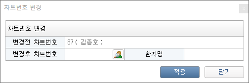 검색결과 선택 후 [차트번호 변경] 버튼 클릭 시 차트번호 변경 창이 팝업됩니다.