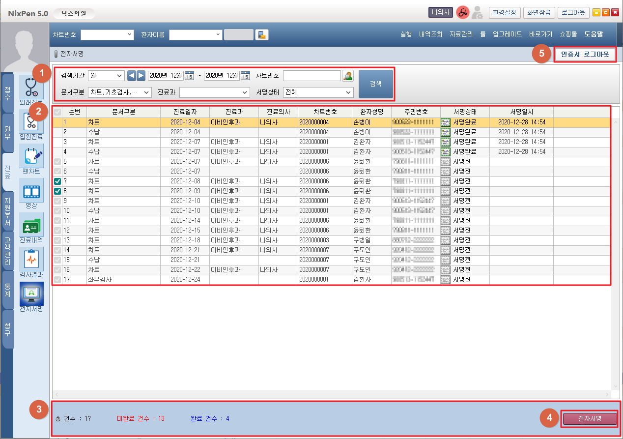 ① 전자서명 대상 문서 검색조건 설정 및 검색을 수행합니다. ② 전자서명 대상 문서 내역을 확인할 수 있습니다. ③ 검색된 전자서명 건수를 확인할 수 있습니다. ④ 체크된 문서구분을 대상으로 일괄적으로 전자서명 승인 합니다. ⑤ 전자서명 인증서 로그아웃 합니다. 1. 전자서명 화면