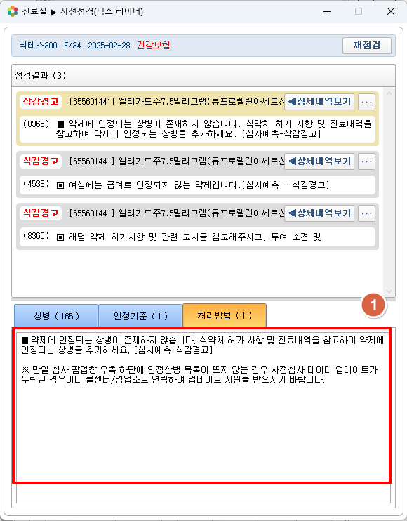 처리방법탭을 선택하여 점검결과에 대한 처리방법 내용을 확인합니다.