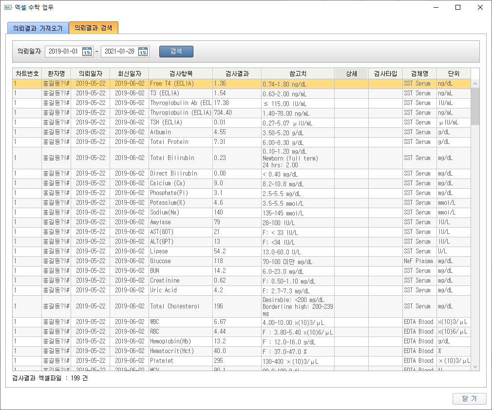 의뢰결과 검색 탭에서는 의뢰결과로 저장된 검사결과 목록을 검색할 수 있습니다.