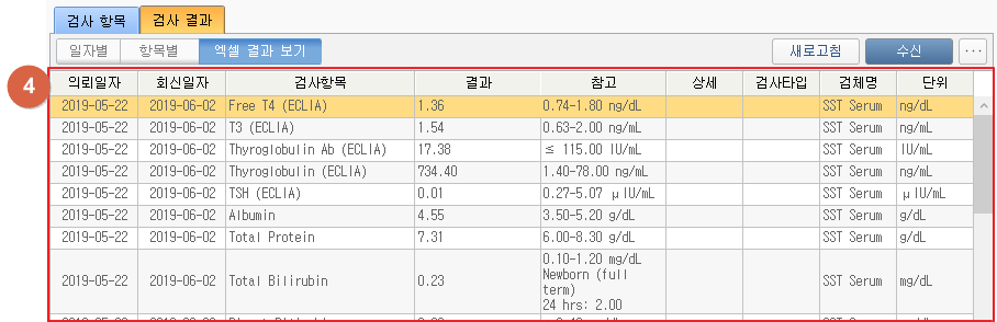 ① [새로고침] 버튼 클릭 시 검사결과 목록을 새로고침합니다. [수신] 버튼 클릭 시 수탁검사 정보를 수신합니다. [...]버튼 클릭 후 [검사결과지 출력] 컨텍스트 메뉴 클릭 시 검사결과지 출력 창이 팝업됩니다. ② 환자의 검사결과 목록을 일자별로 표시합니다. 리스트 / 페이퍼 형식으로 볼 수 있습니다. ③ 환자의 검사결과 목록을 항목별로 표시합니다. ④ 엑셀파일을 불러와 저장한 검사결과를 목록으로 표시합니다. 1. 검사결과