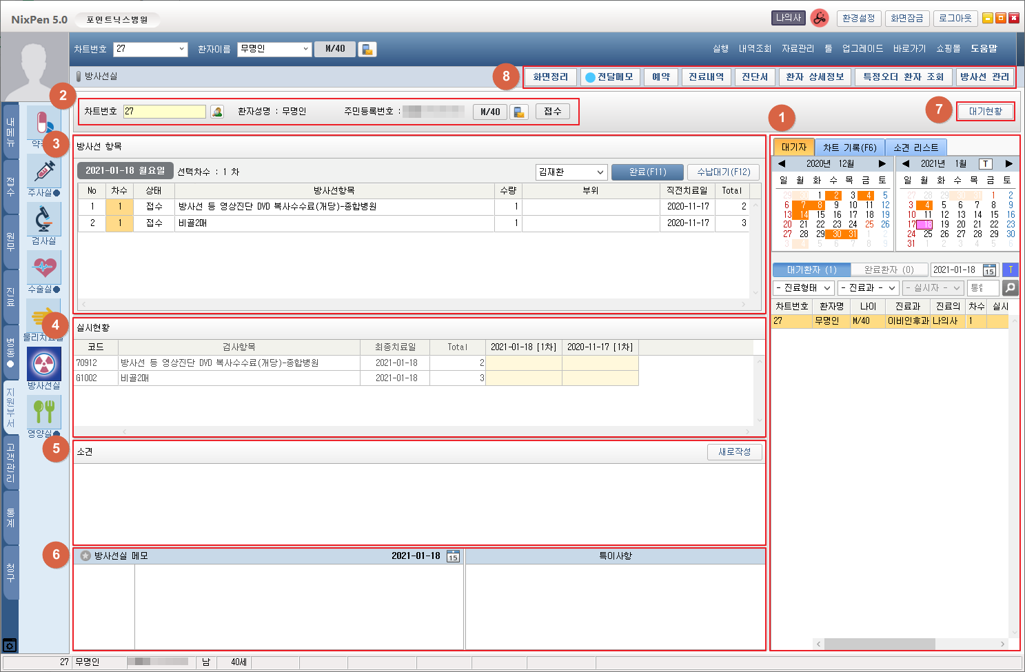 ① 방서선실 대기자 및 차트기록, 소견리스트를 확인할 수 있습니다. ② 환자검색 및 환자 정보를 확인할 수 있습니다. ③ 검색한 환자의 해당 일자의 방사선 오더를 확인할 수 있습니다. ④ 방사선 실시 현황을 확인할 수 있습니다. ⑤ 검사소견을 입력하고 확인할 수 있습니다. ⑥ 방서선실 메모, 특이사항을 확인 및 수정할 수 있습니다. ⑦ [대기현황] 버튼 클릭 시 전체 환자의 대기현황을 볼 수 있습니다. ⑧ 각 기능을 사용할 수 있습니다. 1. 방사선실