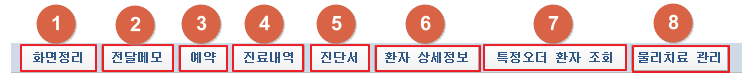① [화면정리] 버튼 클릭 시 환자정보와 방사선 오더 내역이 초기화됩니다. ② [전달메모] 버튼 클릭 시 전달메모 창이 팝업됩니다. ③ [예약] 버튼 클릭 시 예약 창이 팝업됩니다. ④ [진료내역] 버튼 클릭 시 진료내역 화면이 창으로 팝업됩니다. ⑤ [진단서] 버튼 클릭 시 서류발급 화면이 창으로 팝업됩니다. ⑥ [환자상세정보] 버튼 클릭 시 환자상세정보 창이 팝업됩니다. ⑦ [특정내역 환자 조회] 버튼 클릭 시 특정내역 환자 조회 창이 팝업됩니다. ⑧ [방사선 관리] 버튼 클릭 시 방사선 관리 기능과 연결되는 컨텍스트메뉴가 열립니다. 1. 툴 버튼