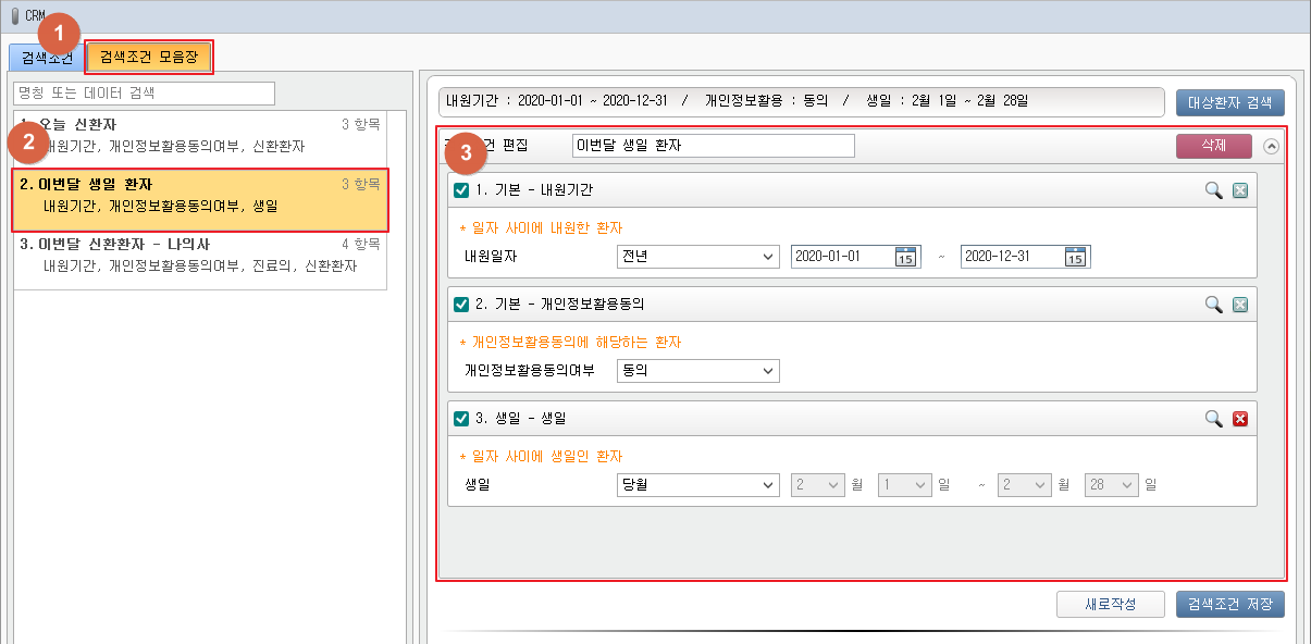 ① [새로작성] 버튼을 클릭합니다. ② 검색 조건명을 입력합니다. ③ 저장하고자 하는 검색조건을 추가 및 편집합니다. ④ [검색조건 저장] 버튼을 클릭합니다. ⑤ [검색조건 모음장] 탭에서 저장된 검색조건을 확인 합니다. ⑥ [삭제] 버튼을 클릭하여 현재 검색조건을 삭제할 수 있습니다. 1. 검색조건 저장