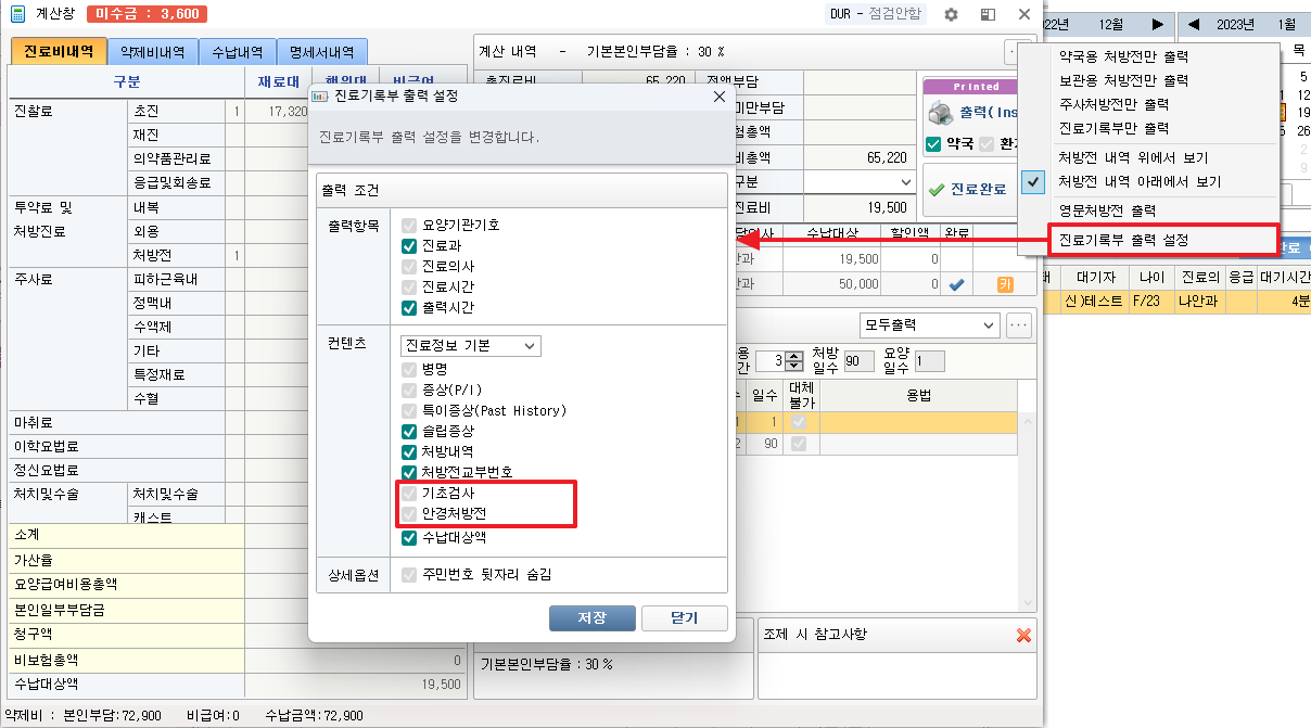 2) 계산 내역 우측 [...] 버튼 Click - [진료기록부 출력 설정] 메뉴 선택