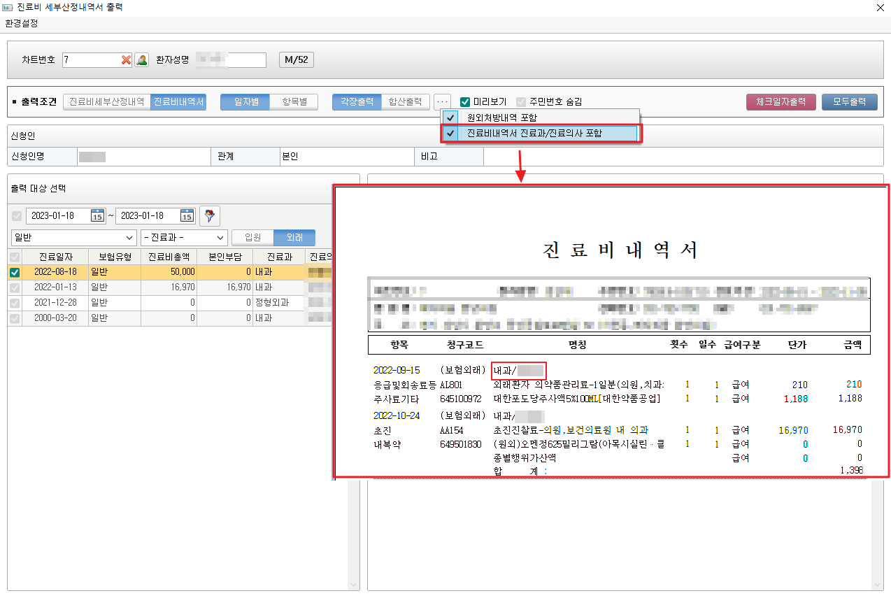 3) 진료비내역서 출력물에서 해당 옵션 적용 확인