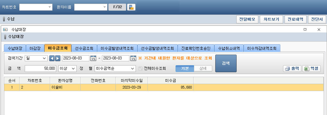 - 심사 - 수납 대장에서 미수금 조회 시 발생액이 아닌 잔액 기준으로 검색되도록 기능 변경