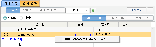 - 차트에 처방된 코드는 유지되며 검사 결과 기록을 삭제합니다.