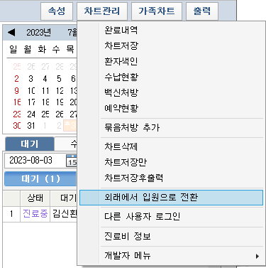 - 입원으로 전환할 외래 차트를 불러온 후 차트 관리의 외래에서 입원으로 전환 메뉴를 수행합니다.