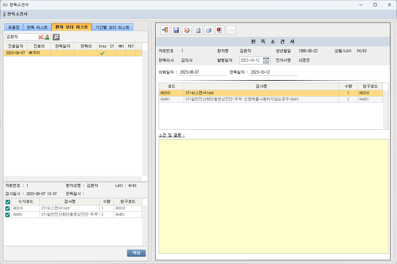 - 청구 시 판독 소견서의 소견 및 결론 이 줄단위 메모