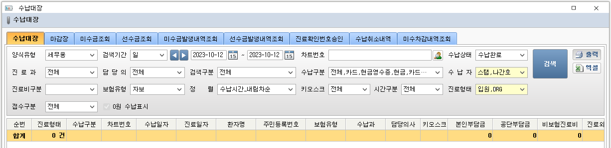 - 원무 - 수납 대장에서 진료형태 및 수납자 를 다중 선택할 수 있도록 검색 기능 확장