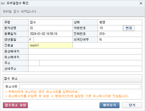 - 차트번호가 매핑된 경우 모바일 접수 확인 창이 팝업되지 않습니다.