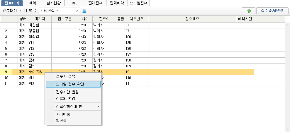 - 대상 예약 우클릭 시 모바일 접수 확인 메뉴가 표시됩니다.