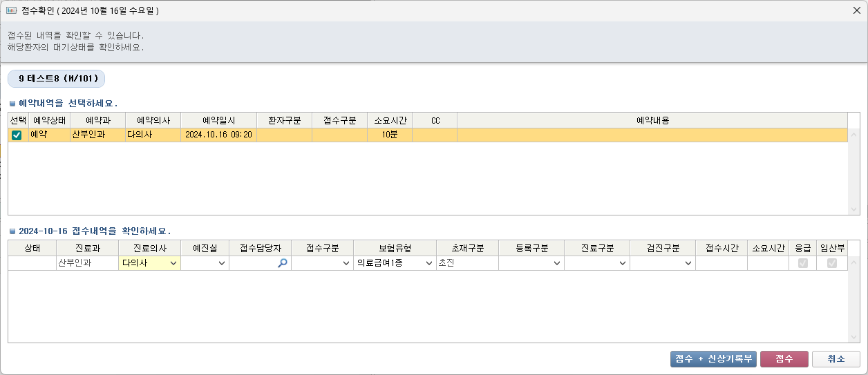 - 접수 확인 창 팝업 시 예약 의사가 자동으로 선택됩니다.